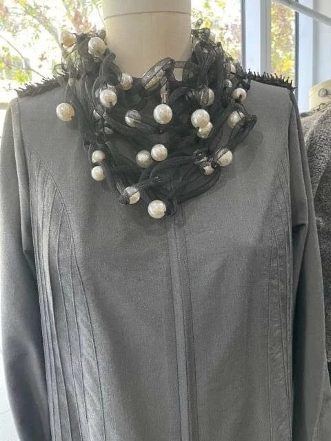GORGEOUS pearl and mesh necklace is 6′ long and can be worn so many ways- definitely a statement piece! These are exclusive to the upcoming ray HARRIS Trunk Show and there are only a few coming!!