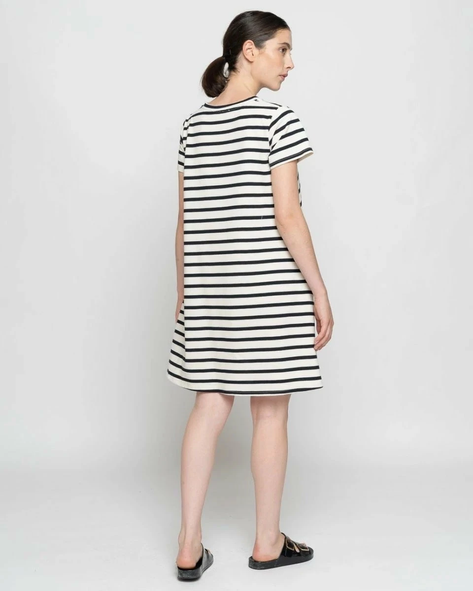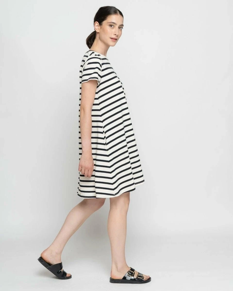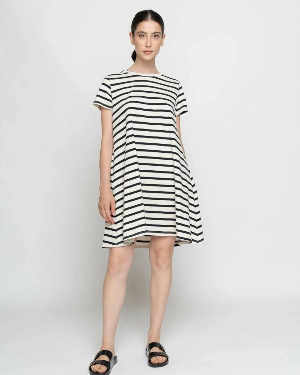 For an effortless look with the Striped Crewneck T-Shirt Dress. It has an ease of wear with it being made from a knit cotton. The dress fits well at the top and then flows down elegantly. A simple neckline and the sleeves, it adds a minimal look to the silhouette.