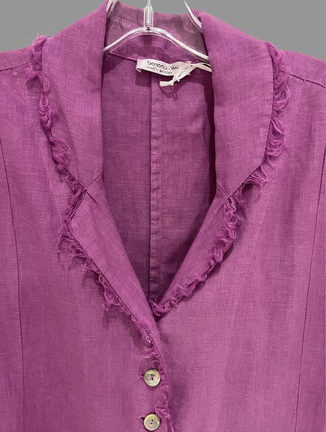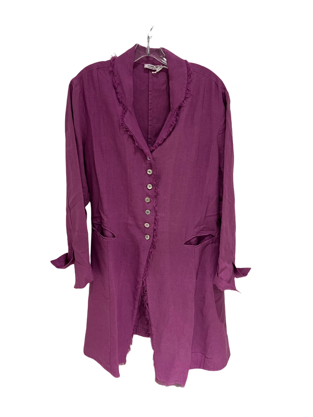 Linen Duster, button front, fray detail and the perfect spring layering piece to wear anywhere! available in Hubba Bubba or Iron