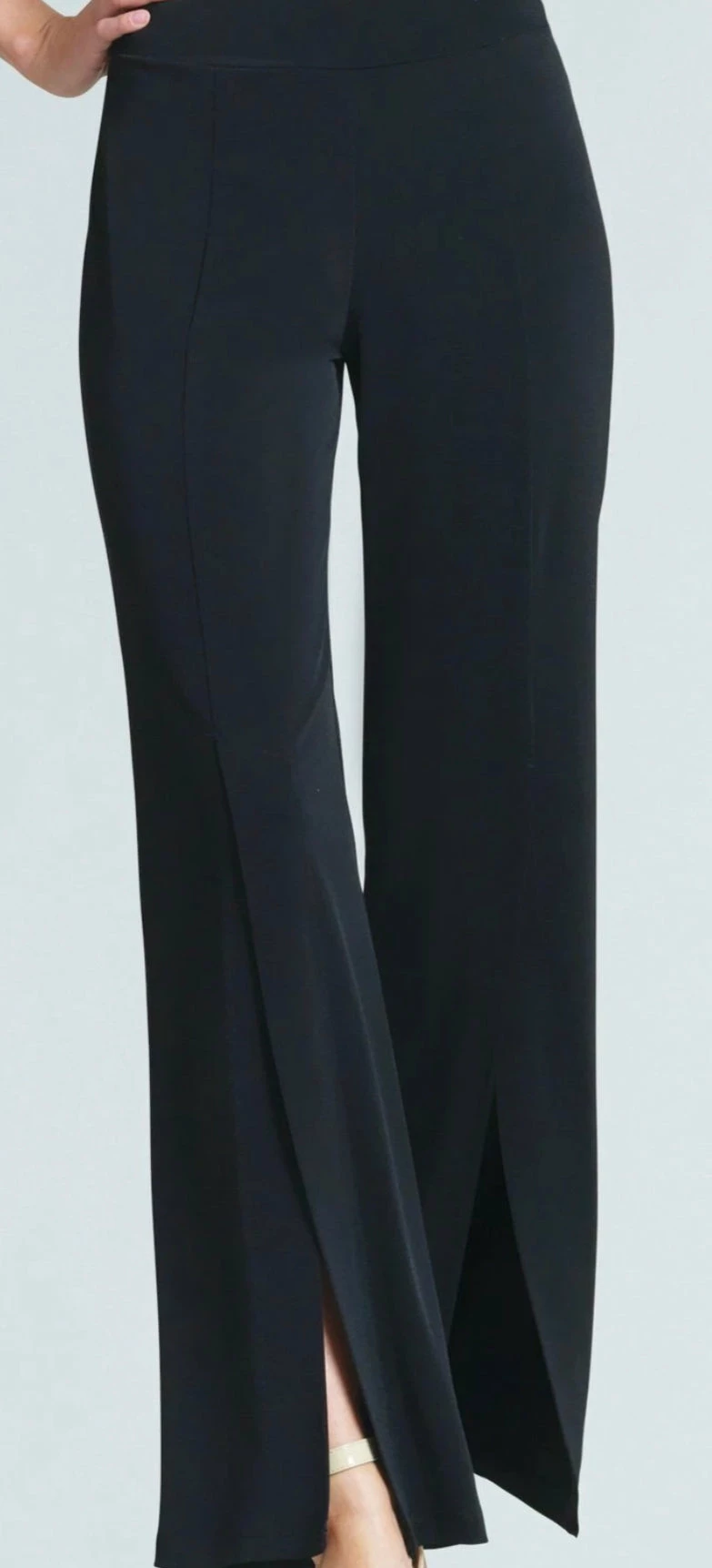 Designed for Betsy Jenney, the Ponte Split Frint Pant is on trend and chic! This pant has an elastic waistband, center leg seam, flared hem and sleek front leg slit which creates a slimming silhouette