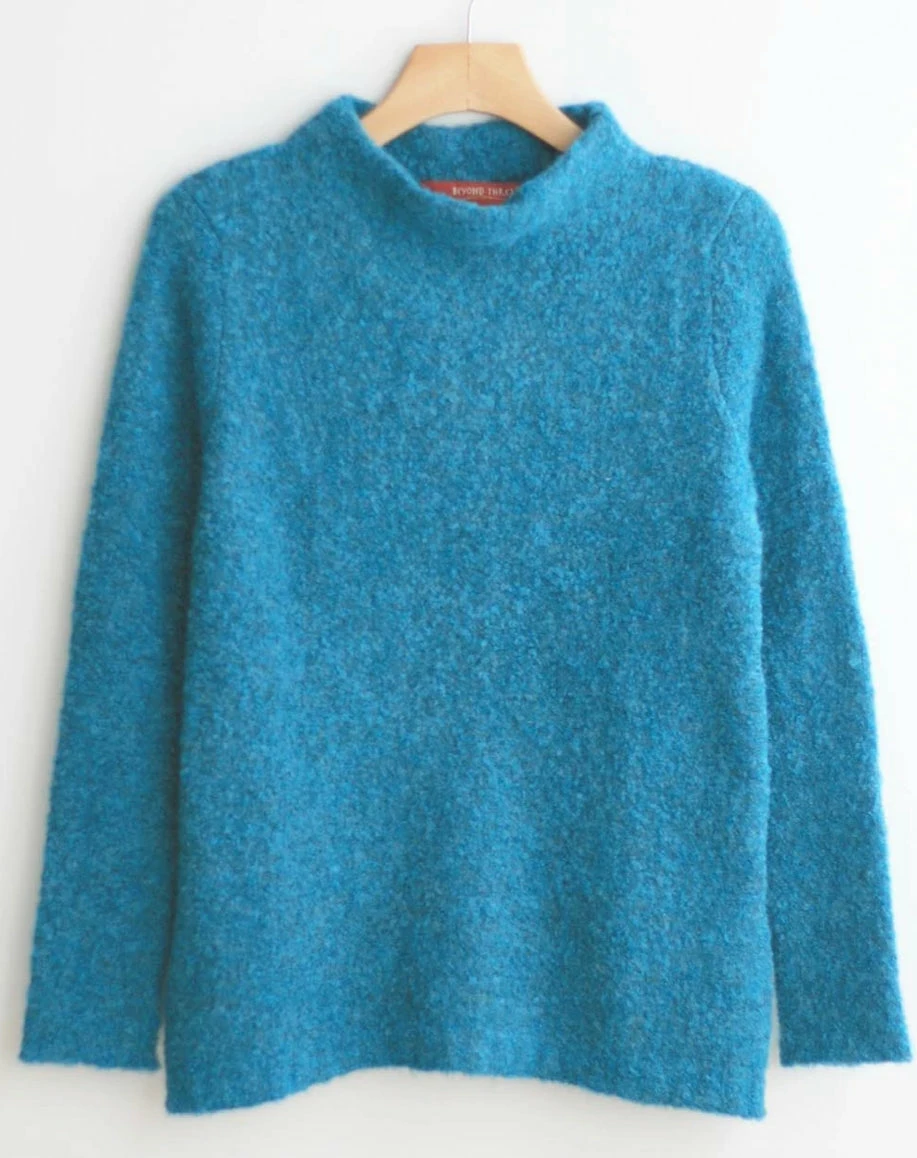 Super soft… and we mean soft… lightweight bouclé sweater with a relaxed turtleneck and luxe texture.