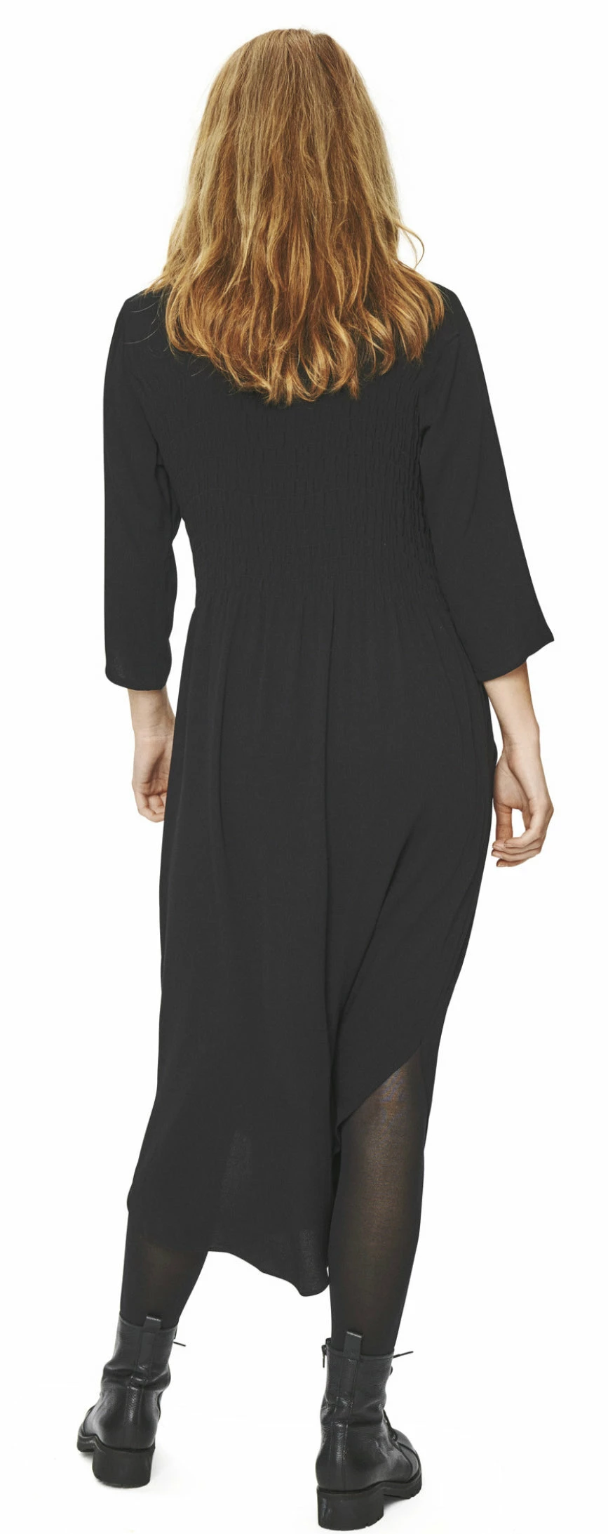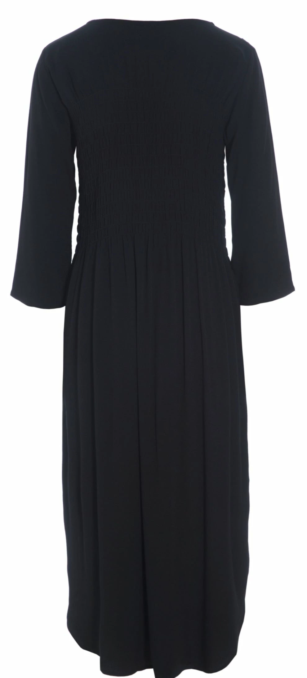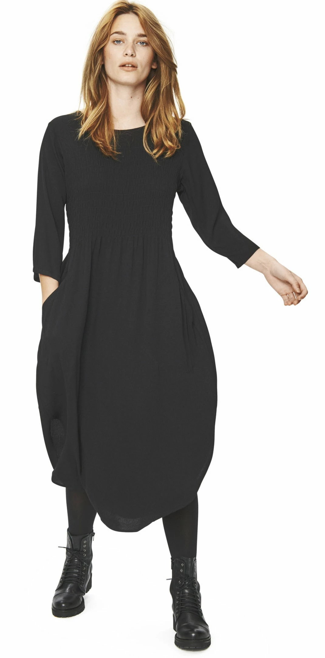 Simple and flattering viscose dress that falls beautifully around the body. The top features smocking while the bottom has a looser fit that creates a lovely feminine silhouette. 3/4 length sleeves and rounded slits at the bottom give the dress an airy quality. Style on its own with coarse boots, or pair with a blazer and sneakers.