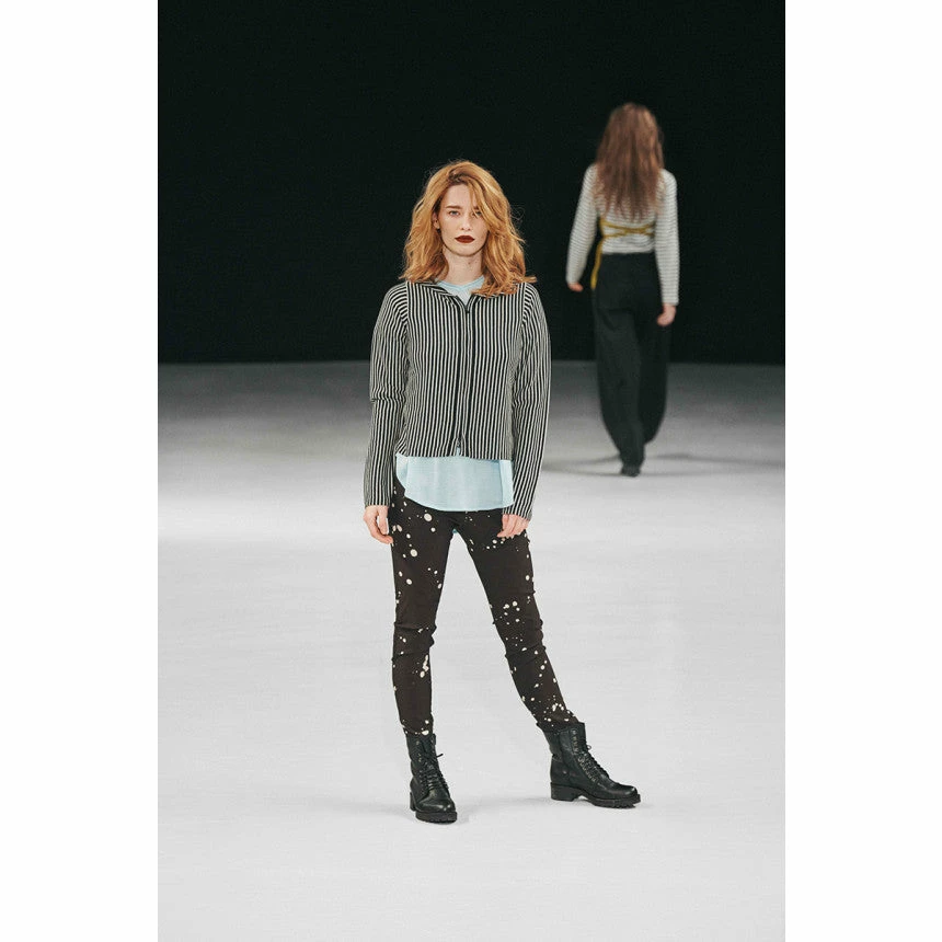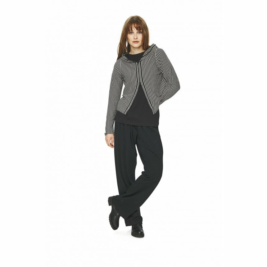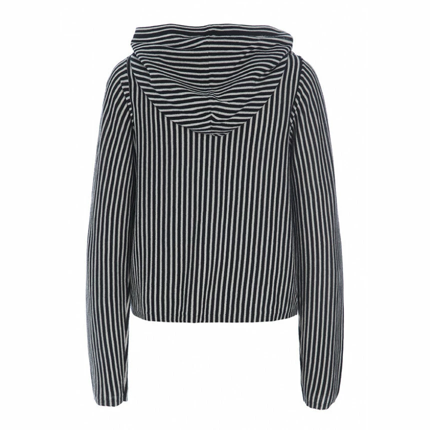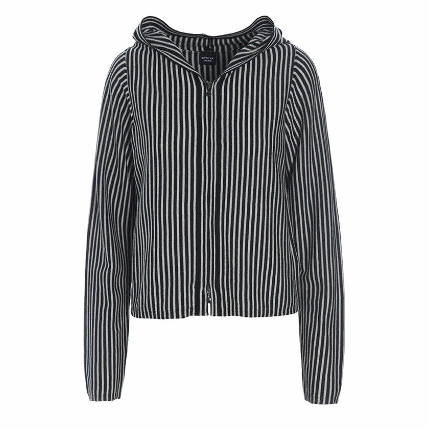 Knit cardigan with a hood and zipper closure. The cardigan is designed with small vertical stripes that have a flattering effect on the body. The blend of extra fine merino wool and cotton makes it warm and soft.