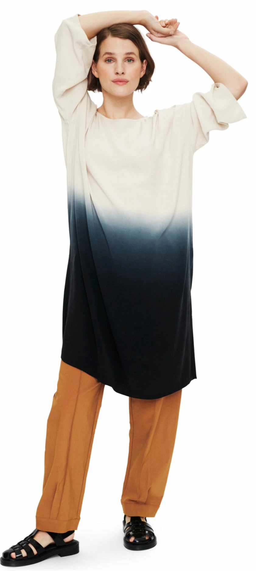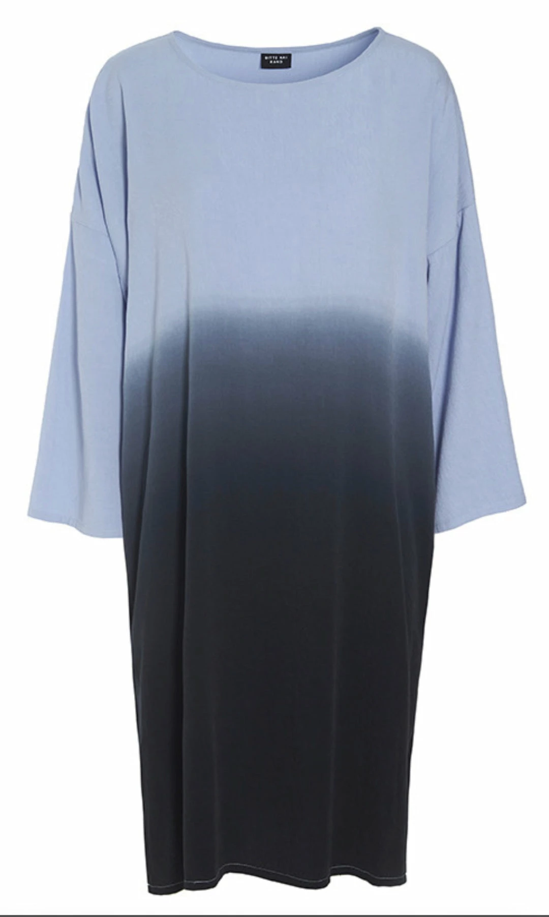 Loose-fitting linen dress that feels comfortable and airy to wear. The dress has a shirt collar and button closure on the top. It is cut across the stomach, giving a nice silhouette. The pattern is made as if it were feather-light strokes from a Japanese calligraphy brush, and it breaks the black background artistically. A very becoming dress, which, together with flat sandals can be worn for virtually any occasion.