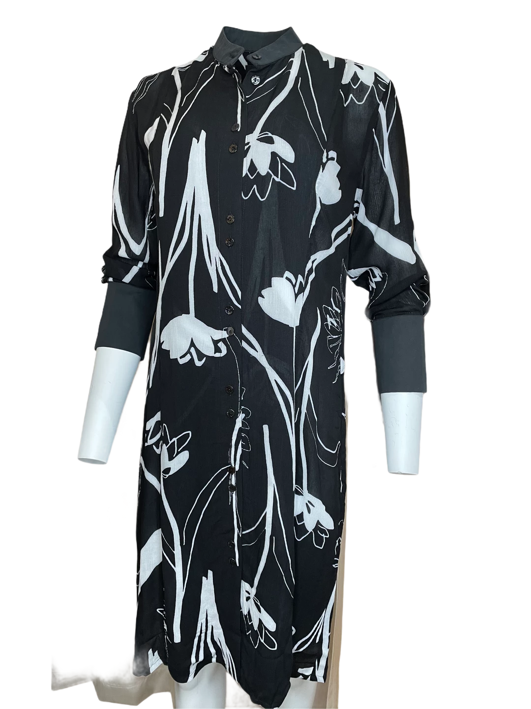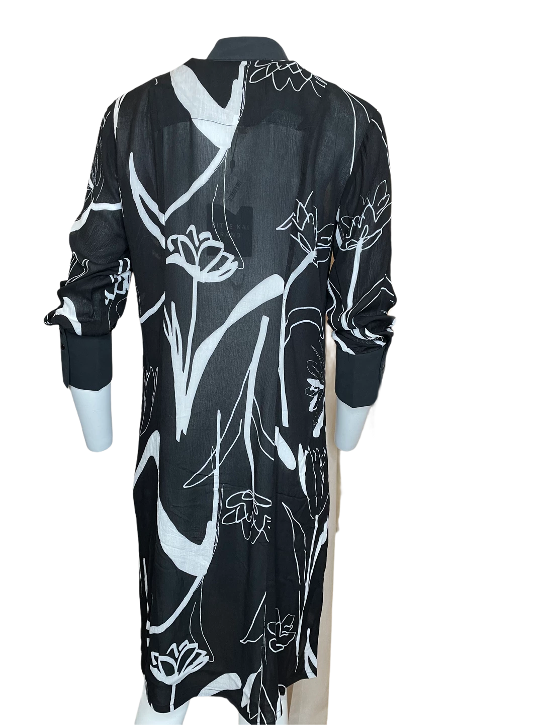Bitte Kai Rand Shirt dress with mandarin collar and long, wide sleeves. This dress has a button closure all the way down and is made from 100% rayon, making it soft and light, with accents done in a cotton blend.