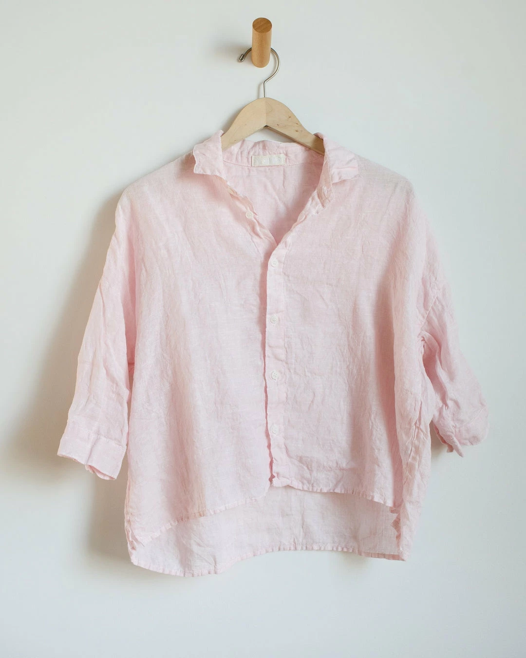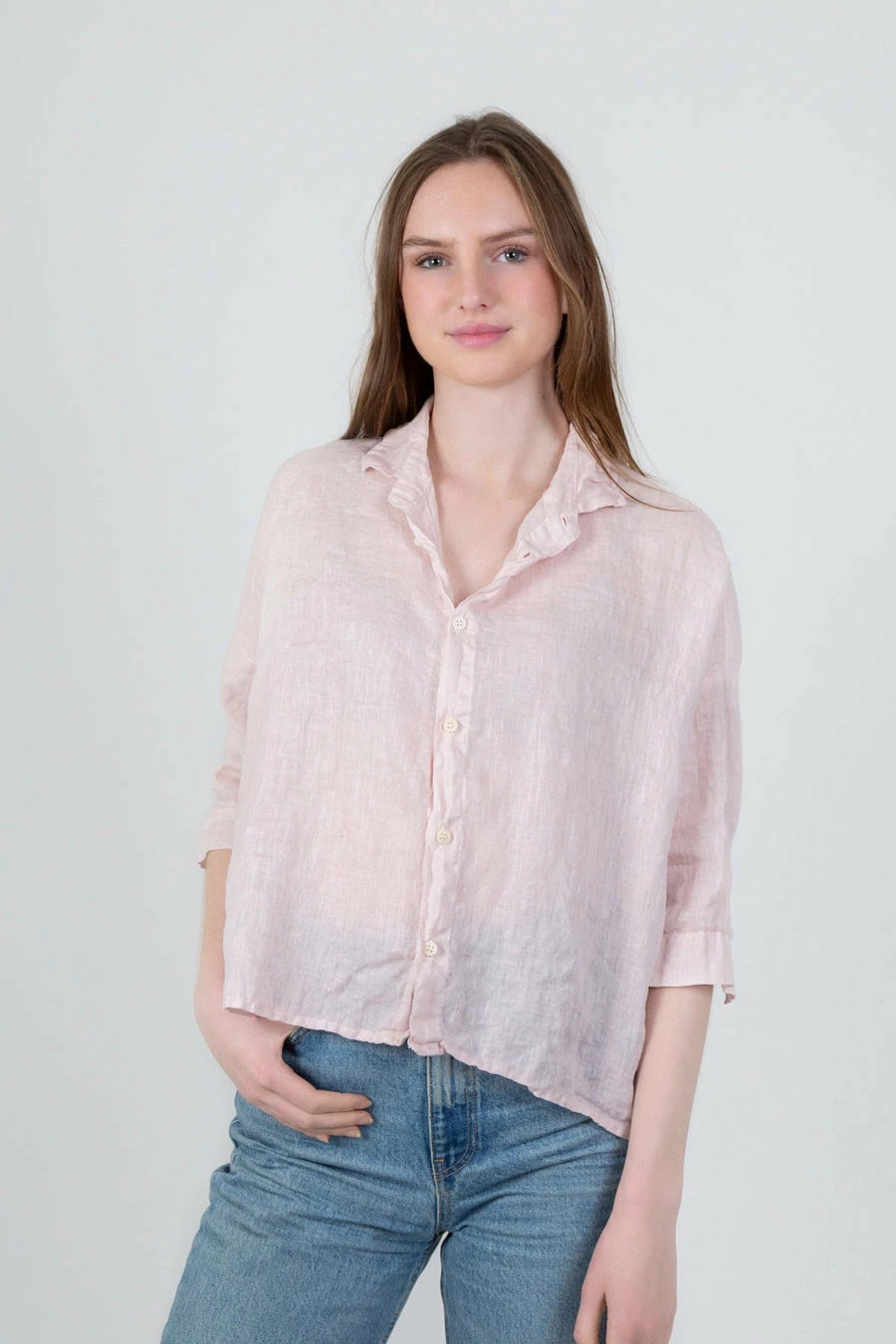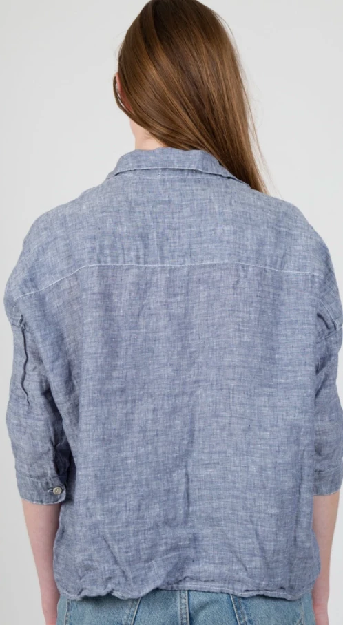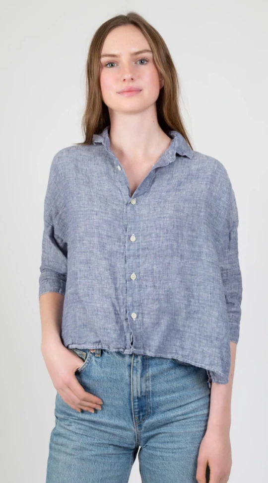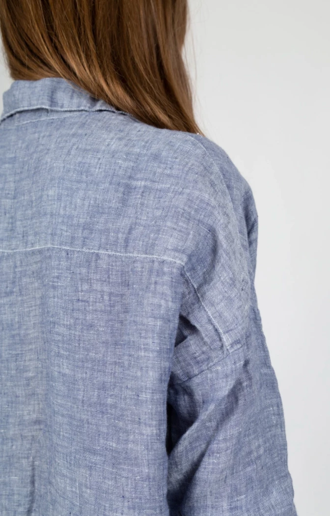A classic cropped shirt silhouette with a cuffed ¾ sleeve and dropped shoulder. It has an exaggerated, boxy relaxed fit. Fits true to size.