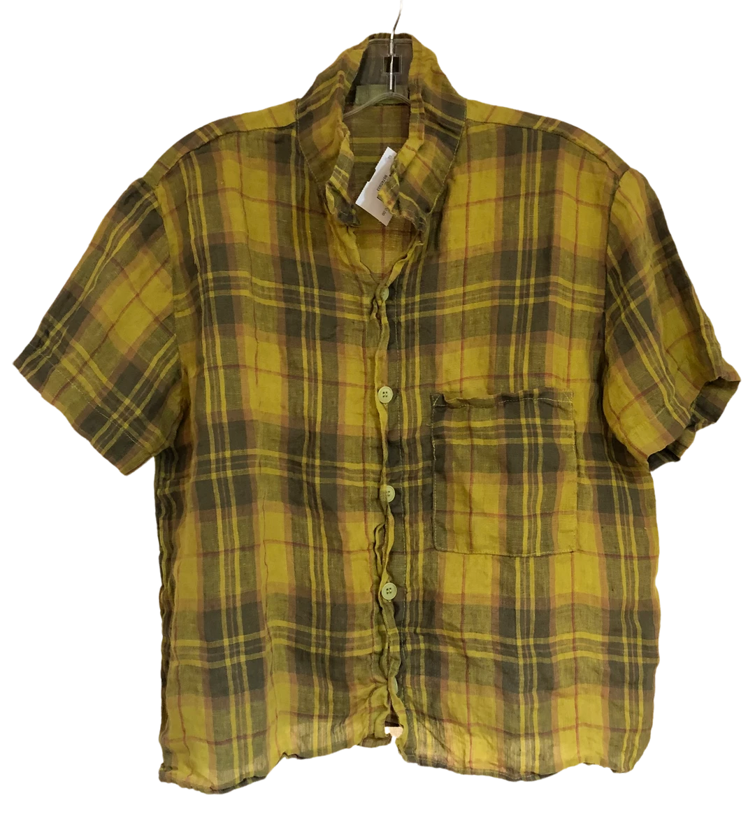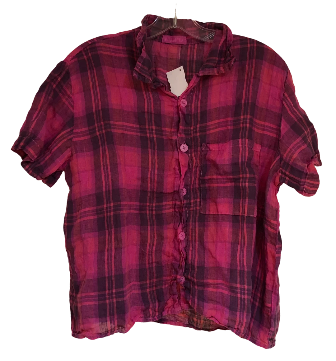 Elevate your plaid! A button-up linen shirt with a boxy silhouette, square front pocket, and collar.