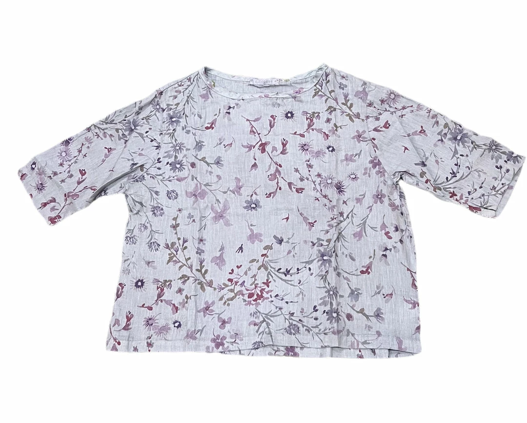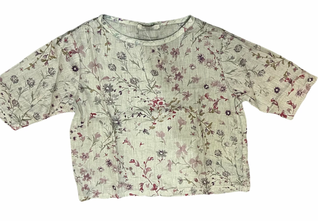Lightweight linen top welcomes spring in feminine fashion. Details include a high round neckline, elbow length sleeves and a simple boxy shape.
