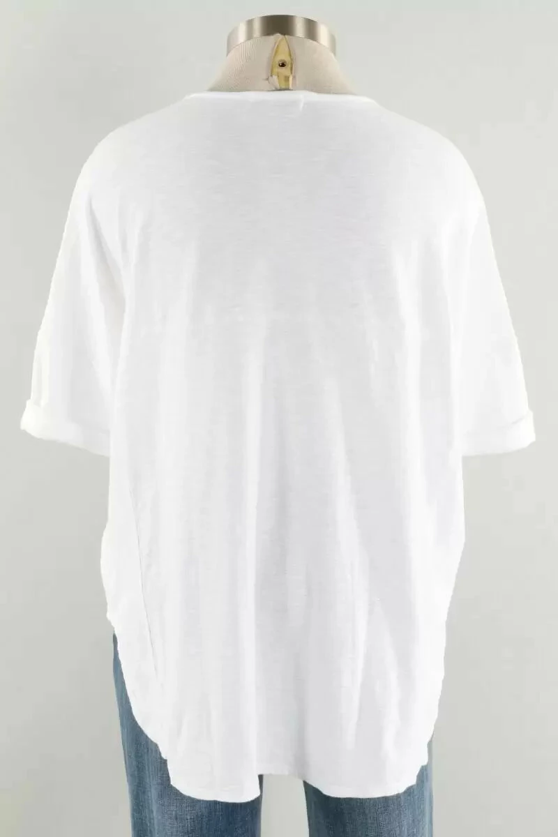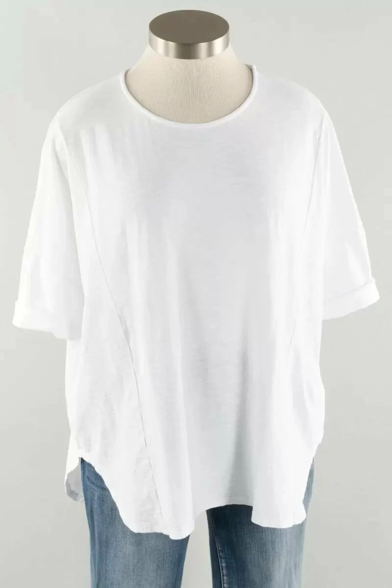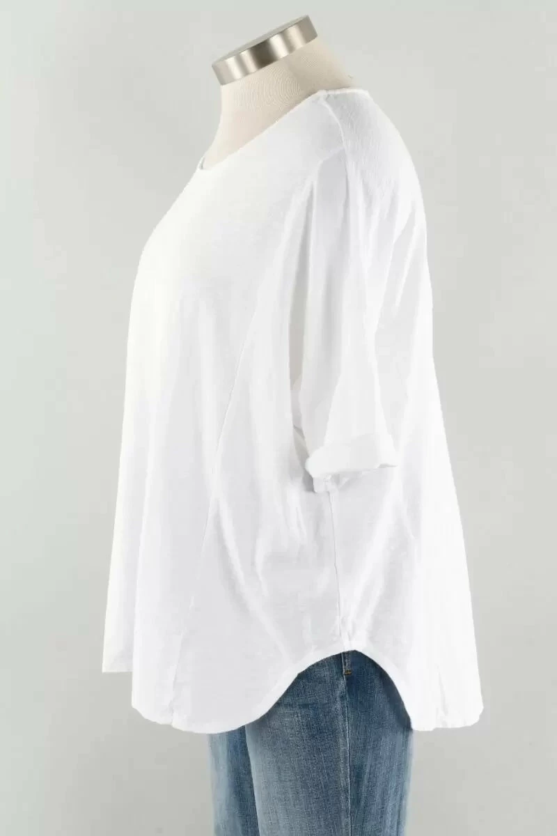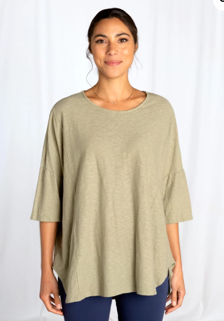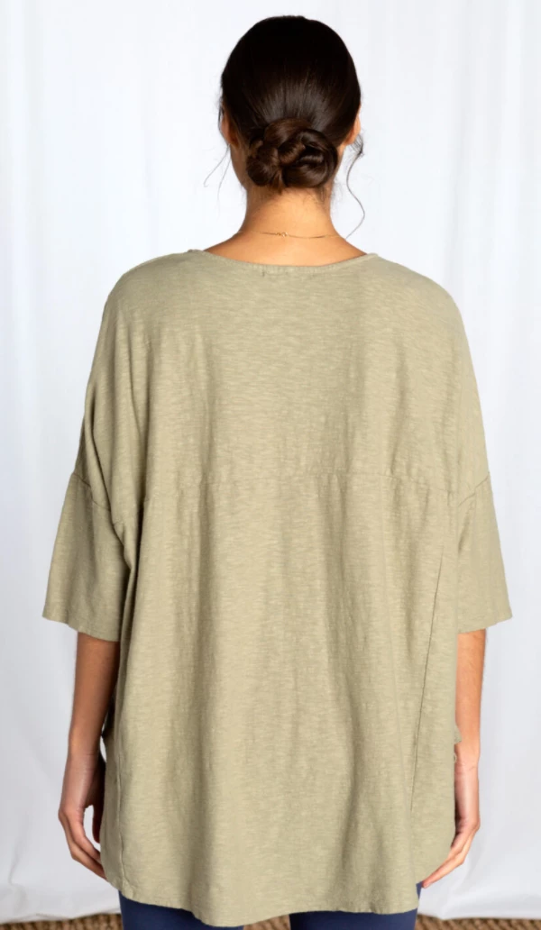 An easy fitting, one size, pullover made in signature linen/cotton blend. It has dropped shoulders for extra room through the body, elbow length sleeves and a round neckline. Finished with a curved shirttail hemline, vertical seams in front and intersecting seams in back.