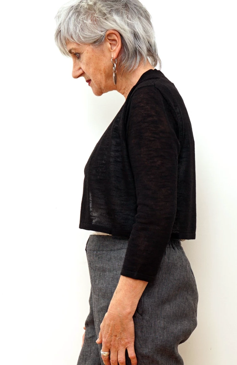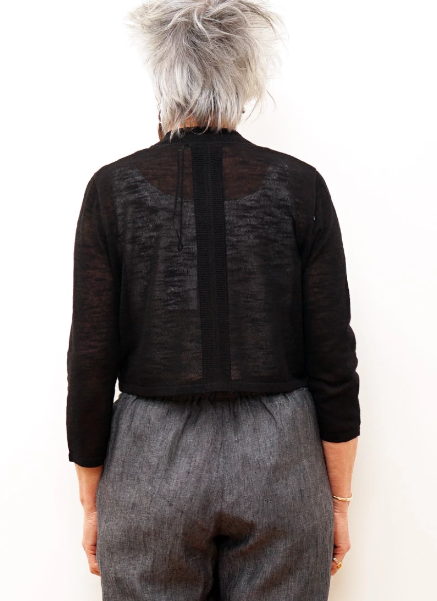 The Purls of Wisdom Shrug is a fabulous little cover up for any occasion. This open style cardigan is sheer and relaxed in silhouette featuring a 3/4 sleeve and cropped style. The Summer Shrug is essential when you feel the need to cover those shoulders and arms. Easy to wear and travel.