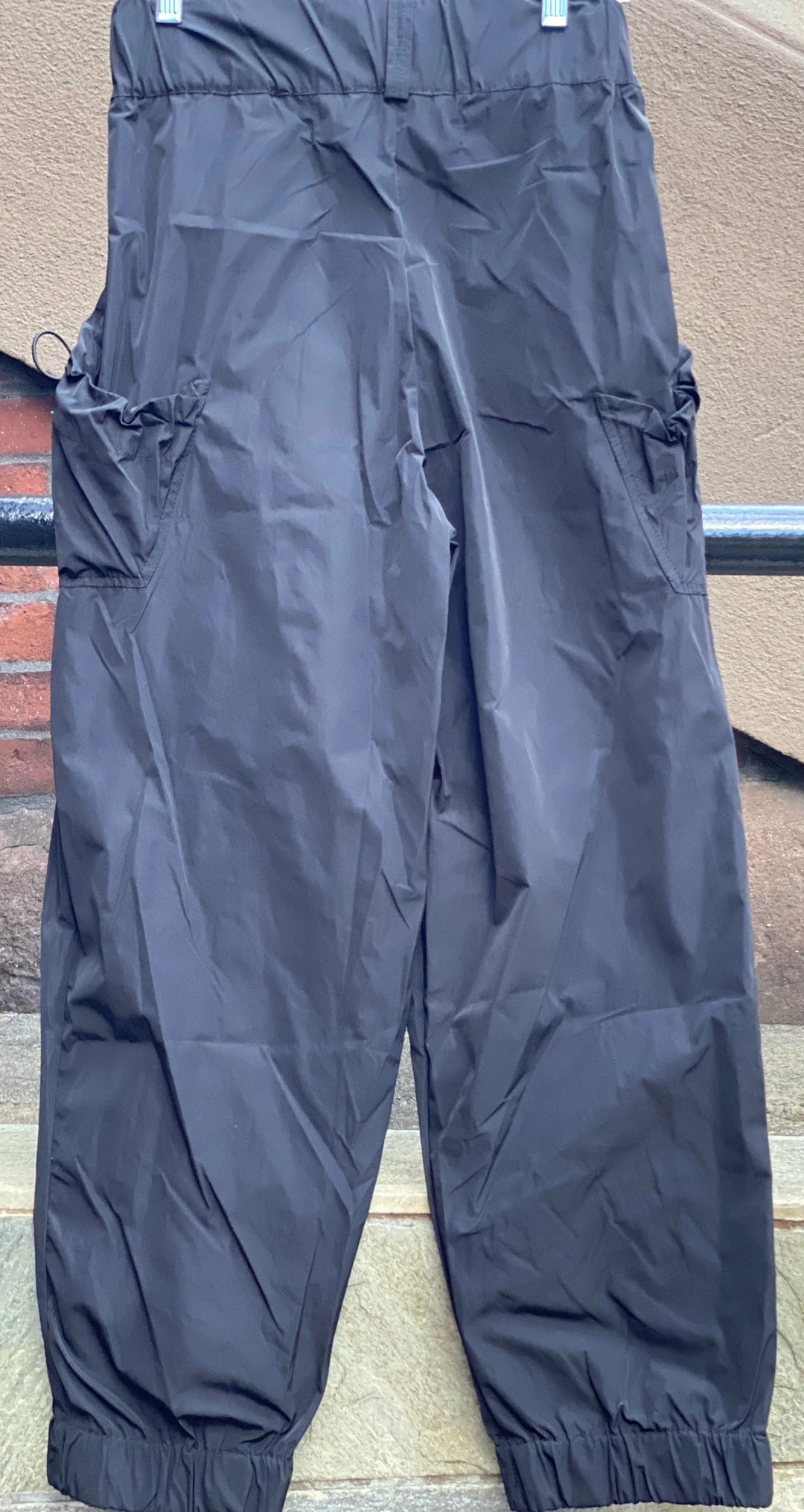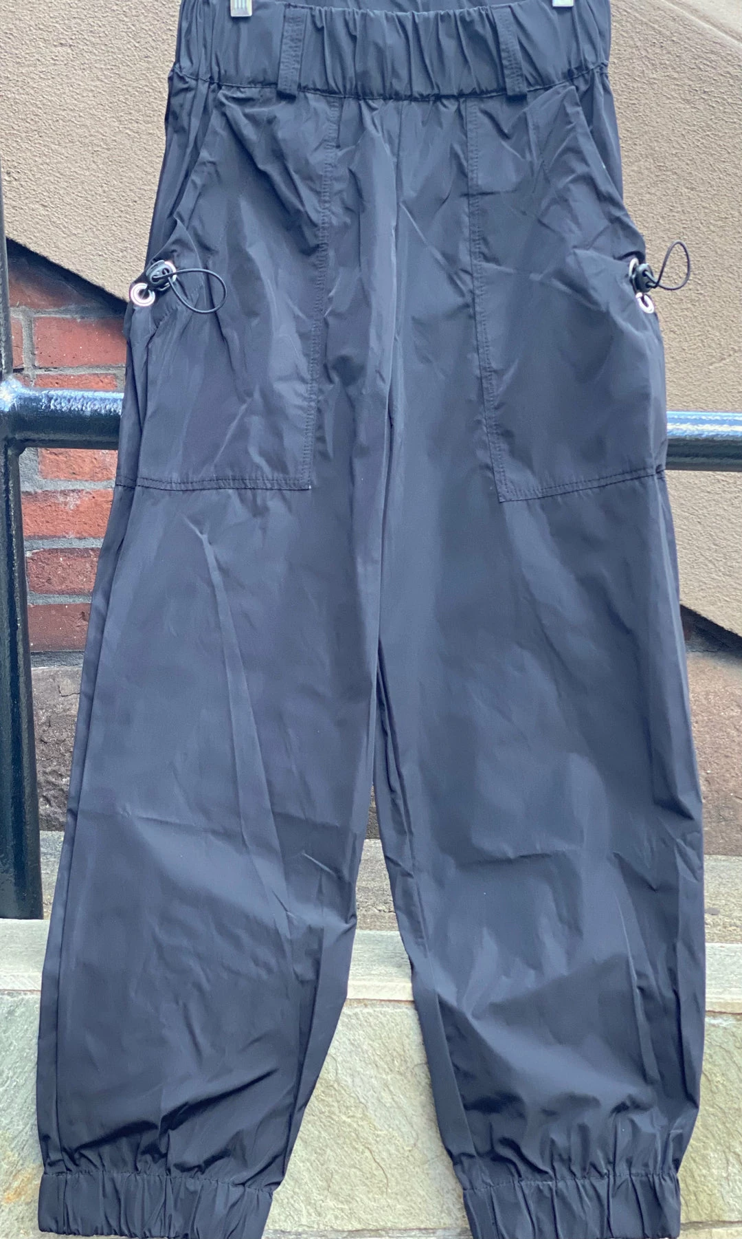 This sports luxe pant is created from a mix of cotton and soft memory fabric. Features include, elastic waistband and cuffs and 2 side pockets with bungee cord closures
