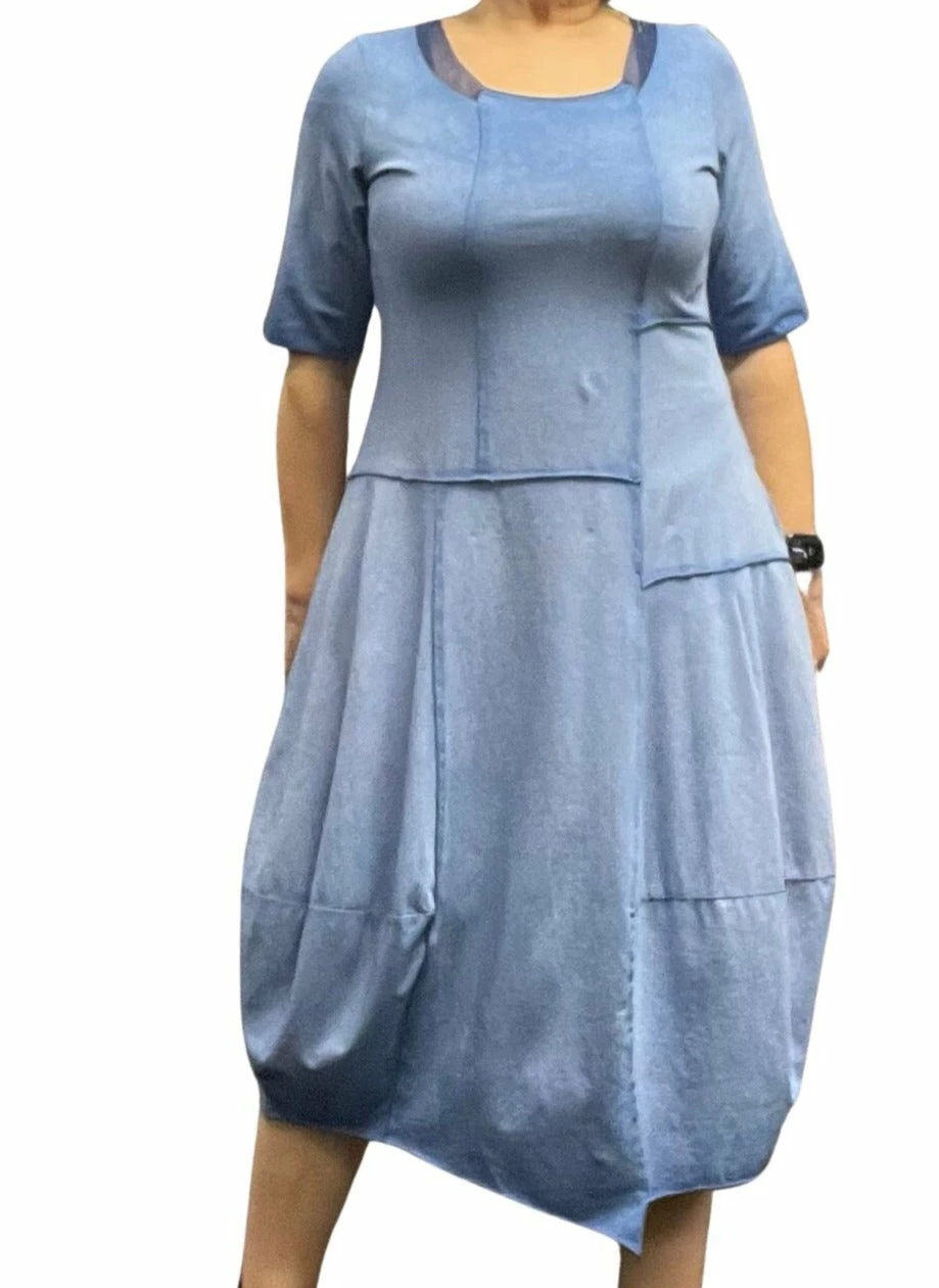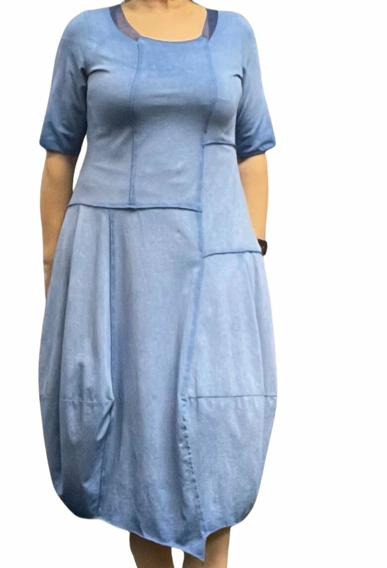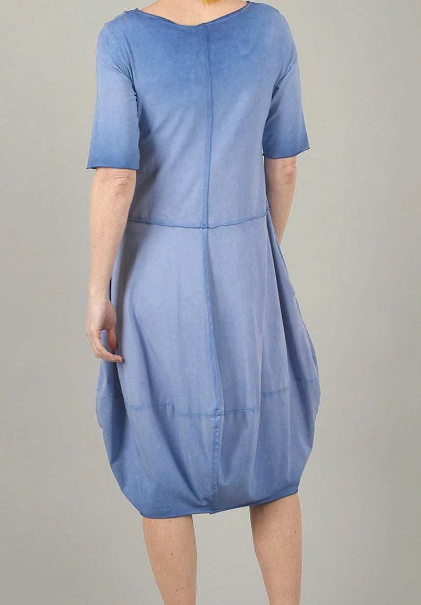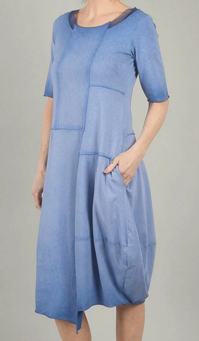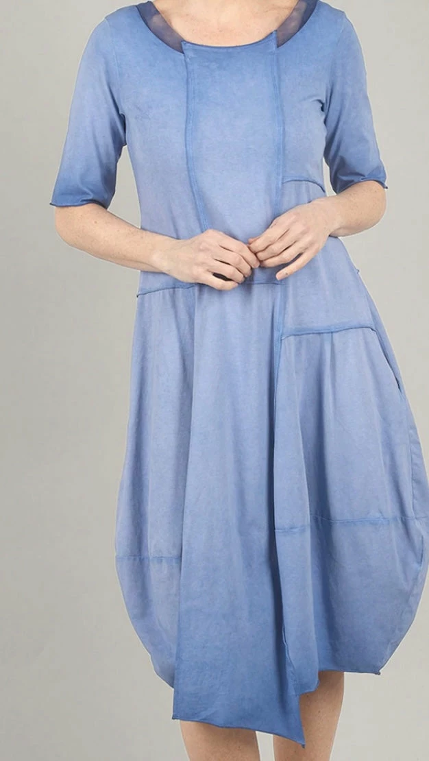 Luuka Done in a soft, garment-dyed jersey knit, the Troy dress has mesh insets at the rounded neckline and elbow-length sleeves. The silhouette is a full lantern shape with slit pockets on the hips. The fit is closer through the bust, but easy through the hips, dimensional seaming adds to its flattering fit. Cotton with a bit of elastane so it keeps it’s shape!