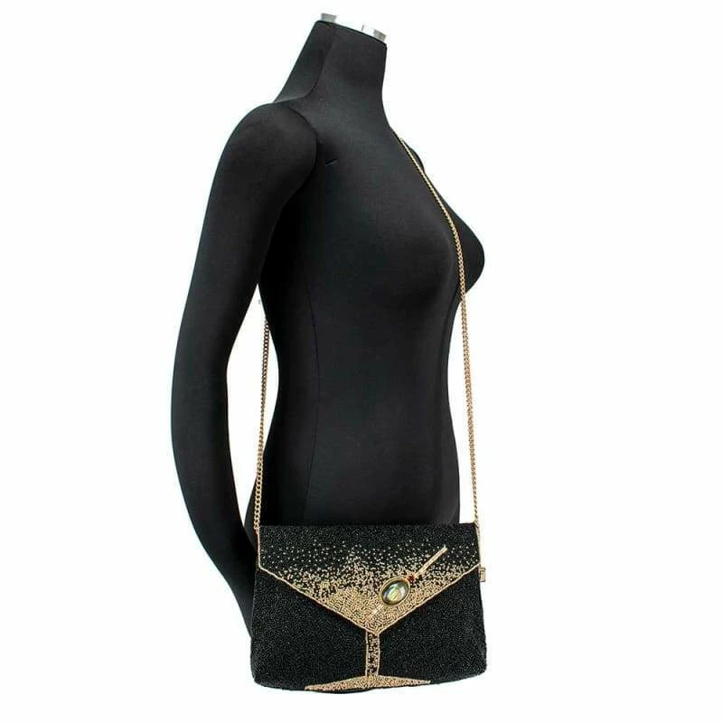 Lift your spirits with this beaded crossbody clutch that is nothing short of sensational! Thousands of hand-sewn beads create a sparkling martini design with a genuine natural Labradorite gemstone, believed to help an individual regain energy, enhancing strength of will and inner worth.