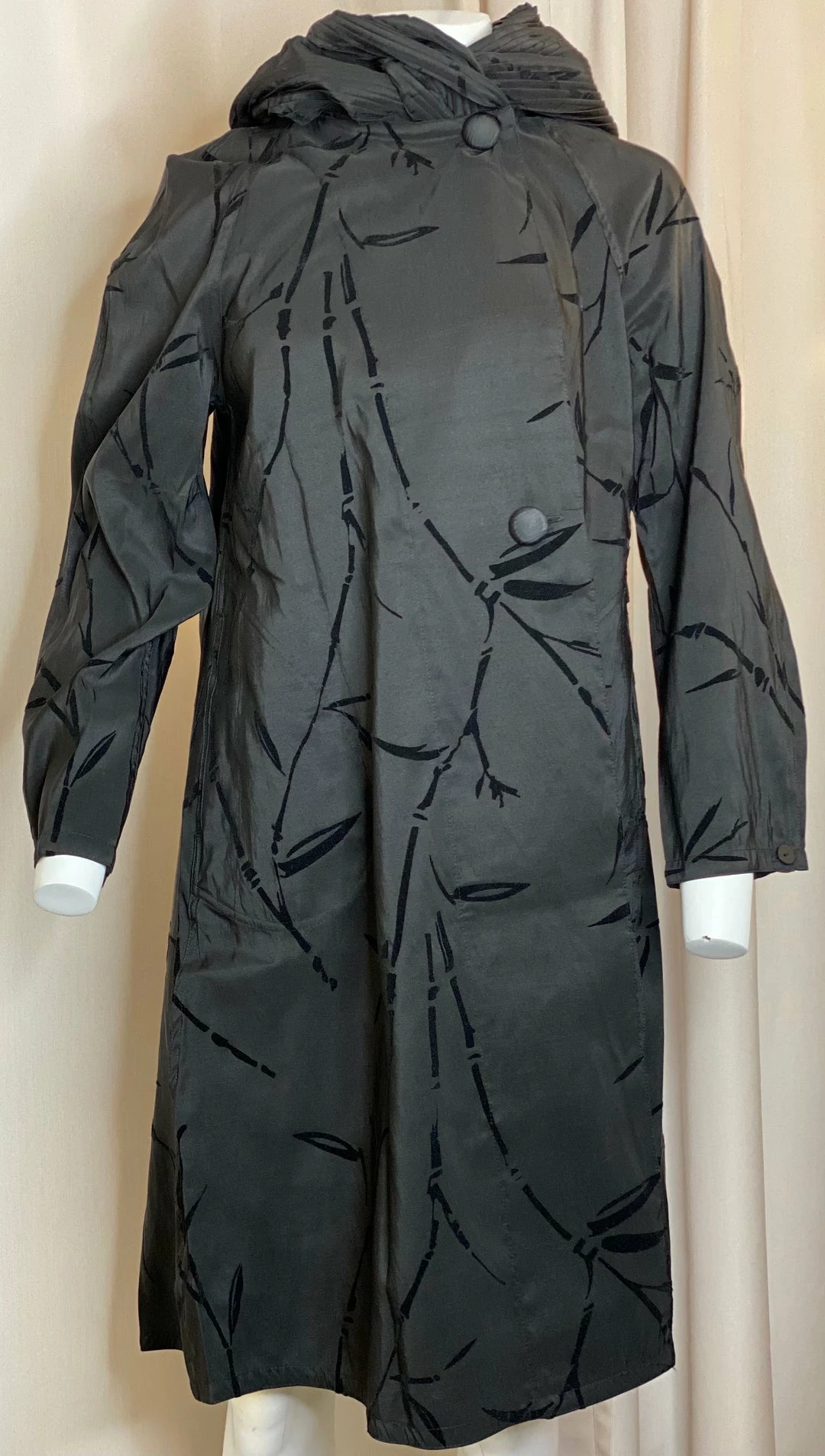 A reversible, water-resistant and lightweight rain jacket falls to the knee in an A-line silhouette. Features include extra long raglan sleeves, deep pockets, and a unique accordion pleat hood which doubles as an elegant shawl collar. Made in the U.S.A.