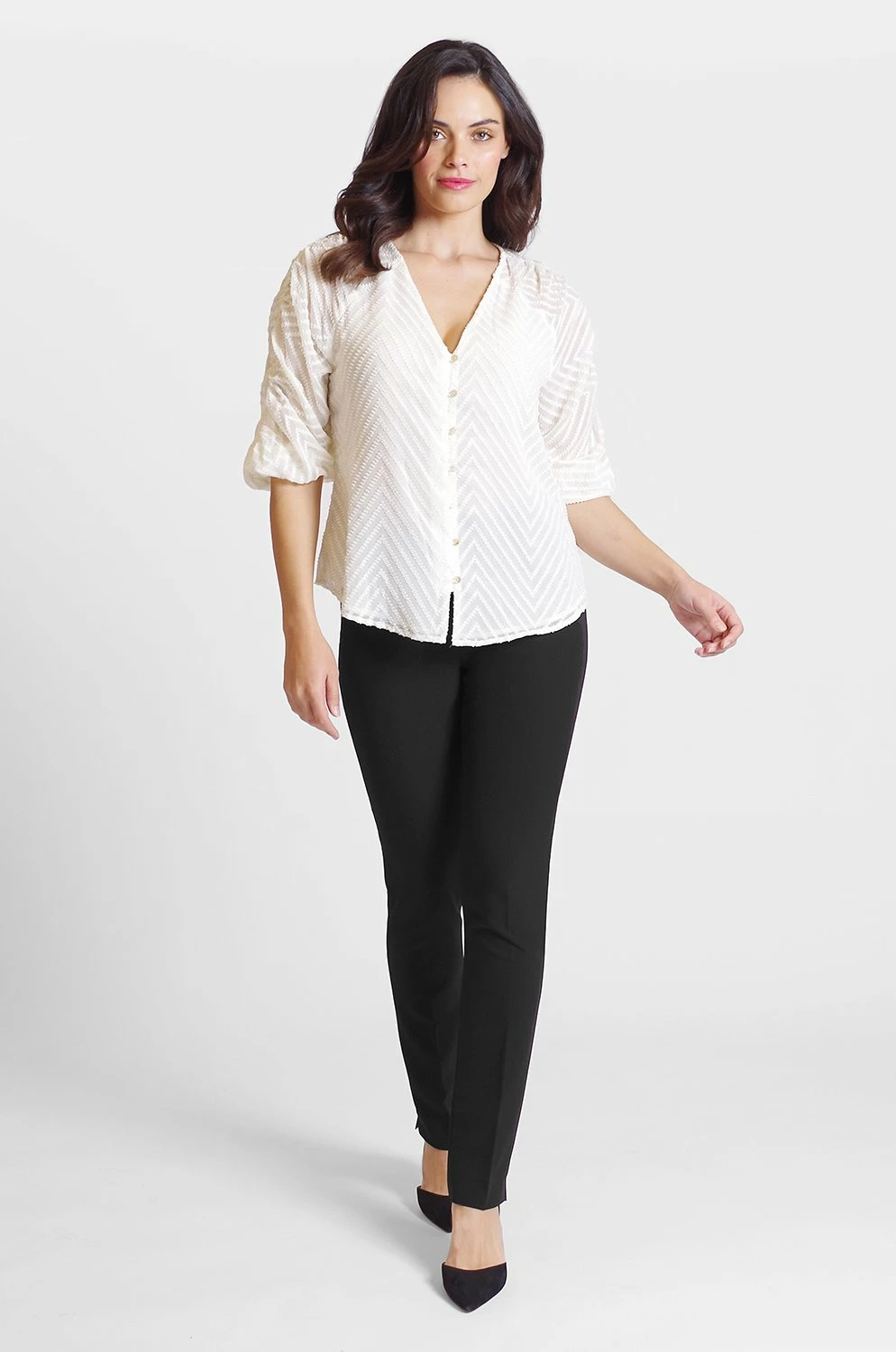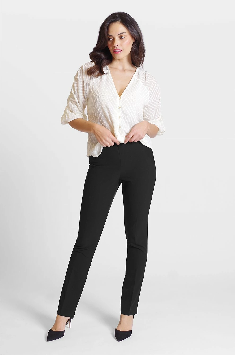 Understated and elegant, this style flatters all body types with a streamline silhouette. A must have in every closet as a staple for refined “desk to dinner” and beyond.