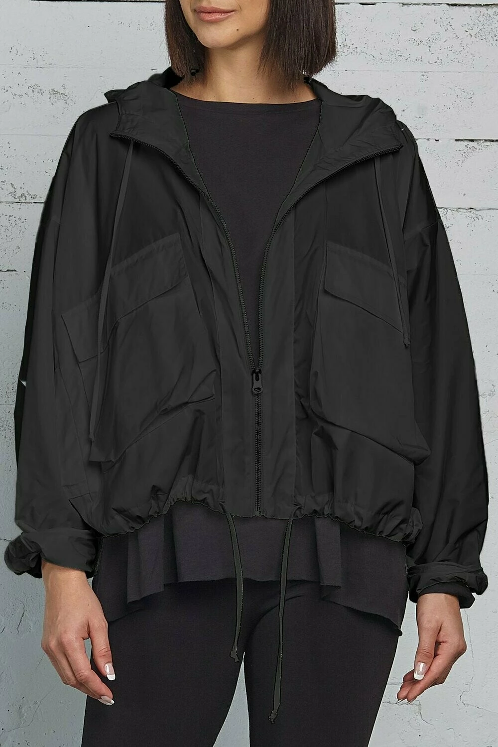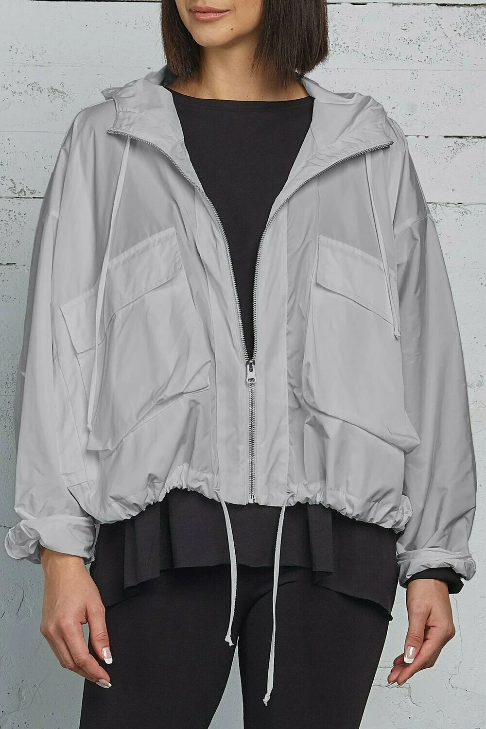 Modern take on the windbreaker makes it a new fashion essential. Easy cropped shape sports a hoodie, drawstring hem, zip closure and patch pockets.