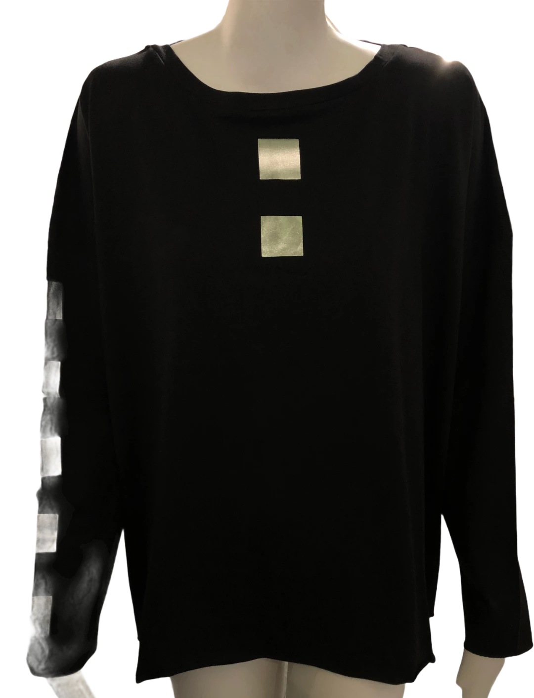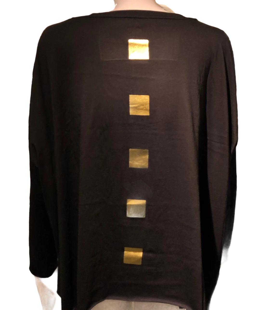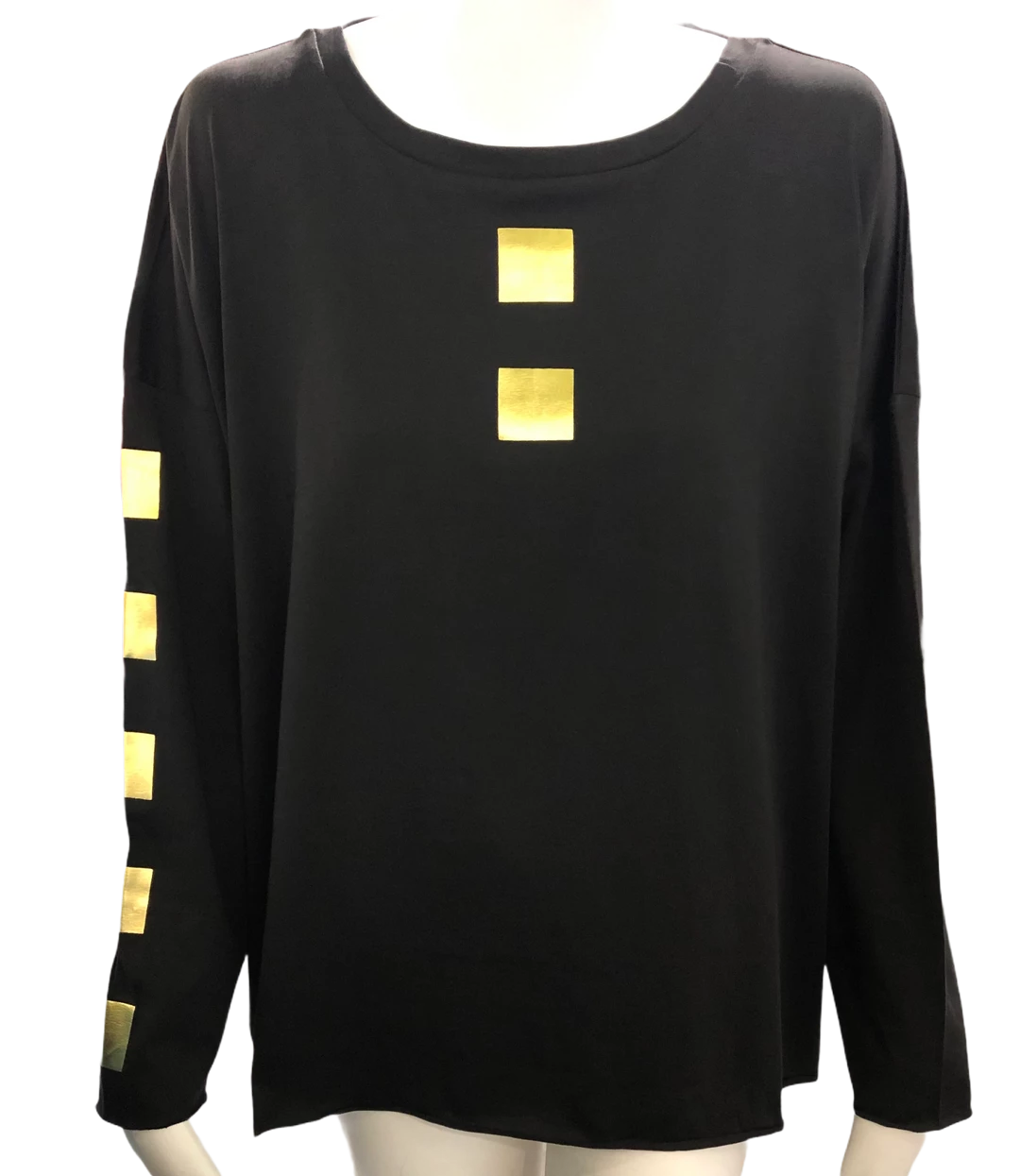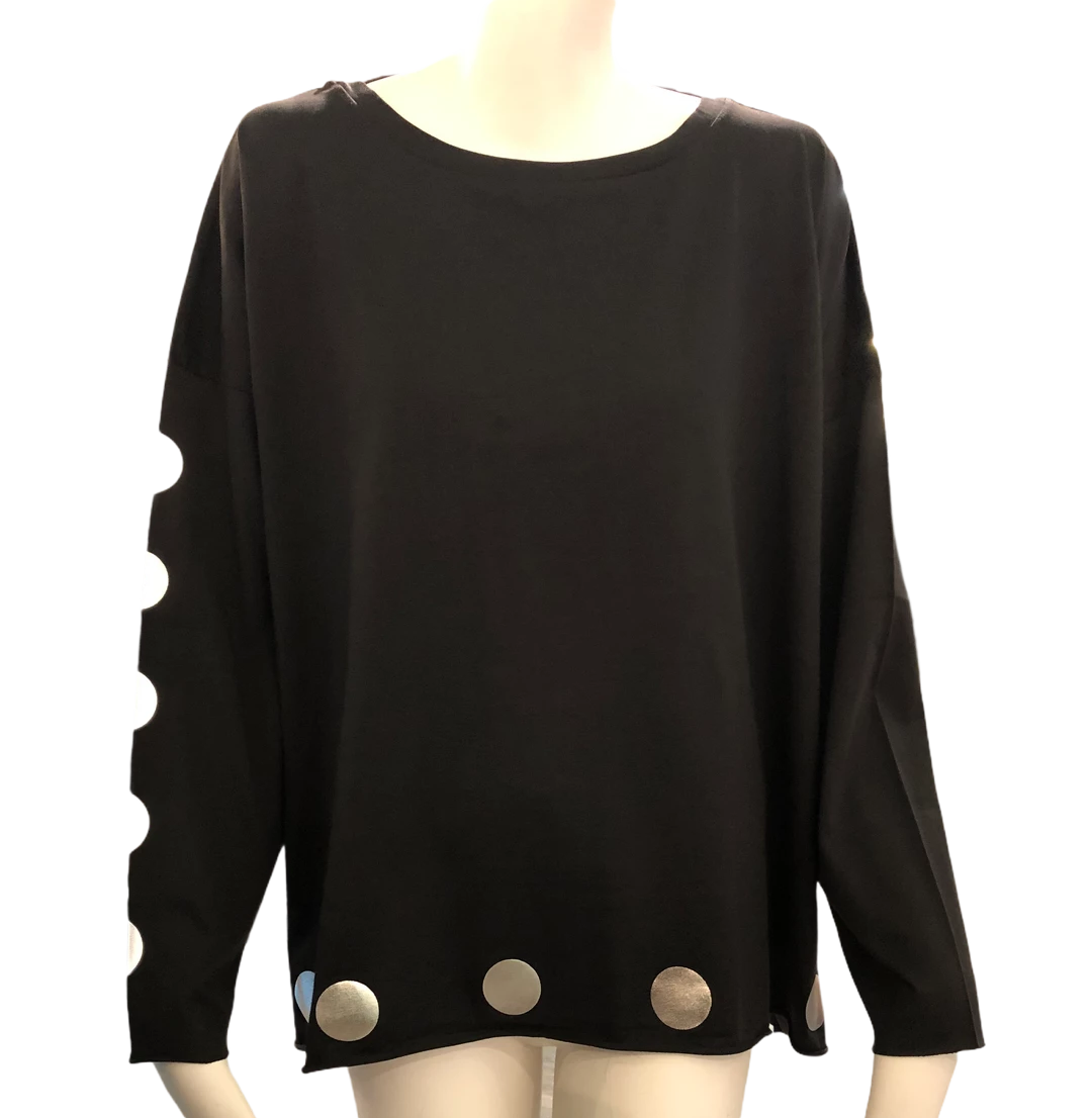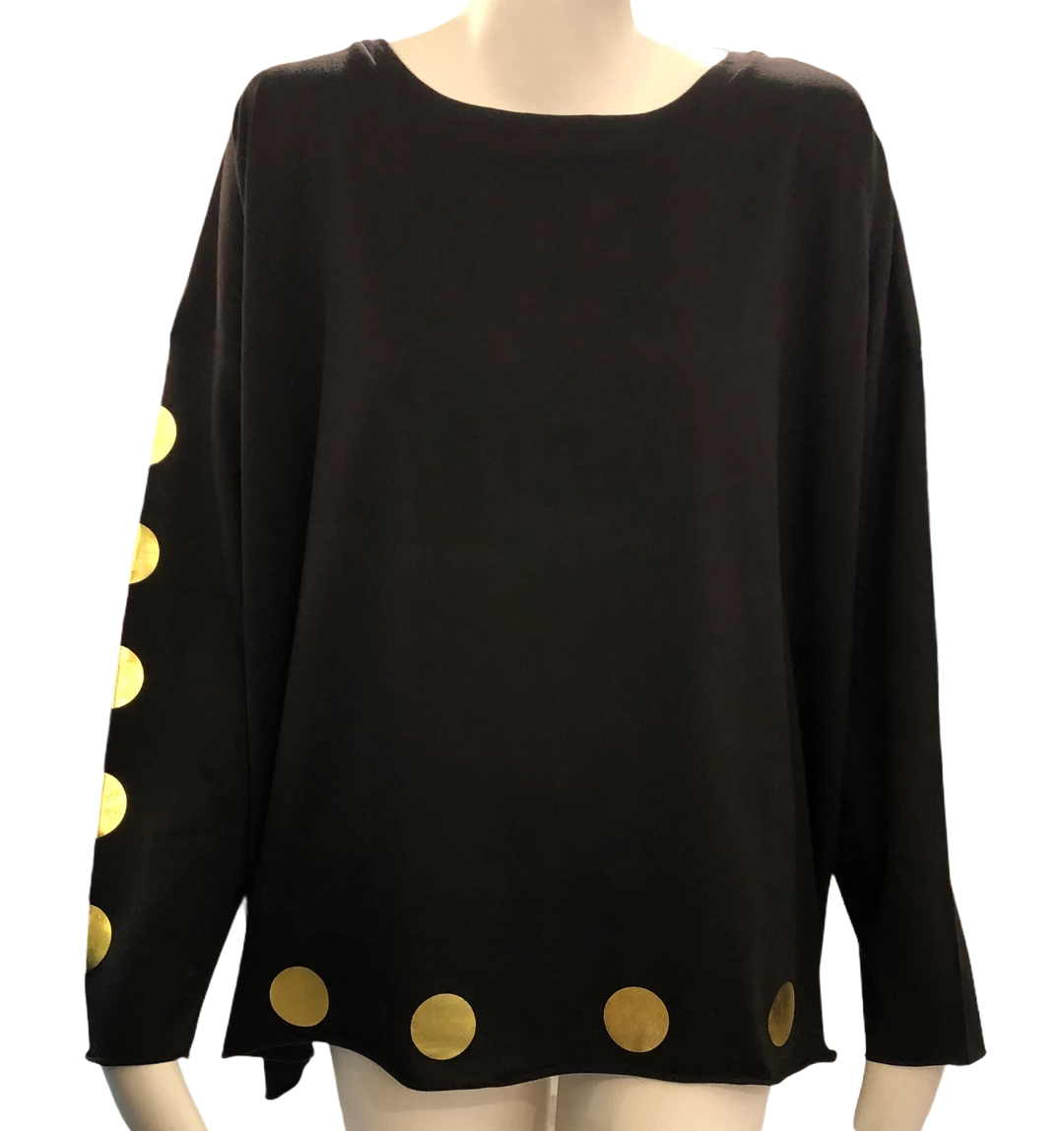 Planet Metallic Tee is One Size and available in Black/Silver or Black/Gold in Cube print or Polka Dot 100% Pima Cotton.