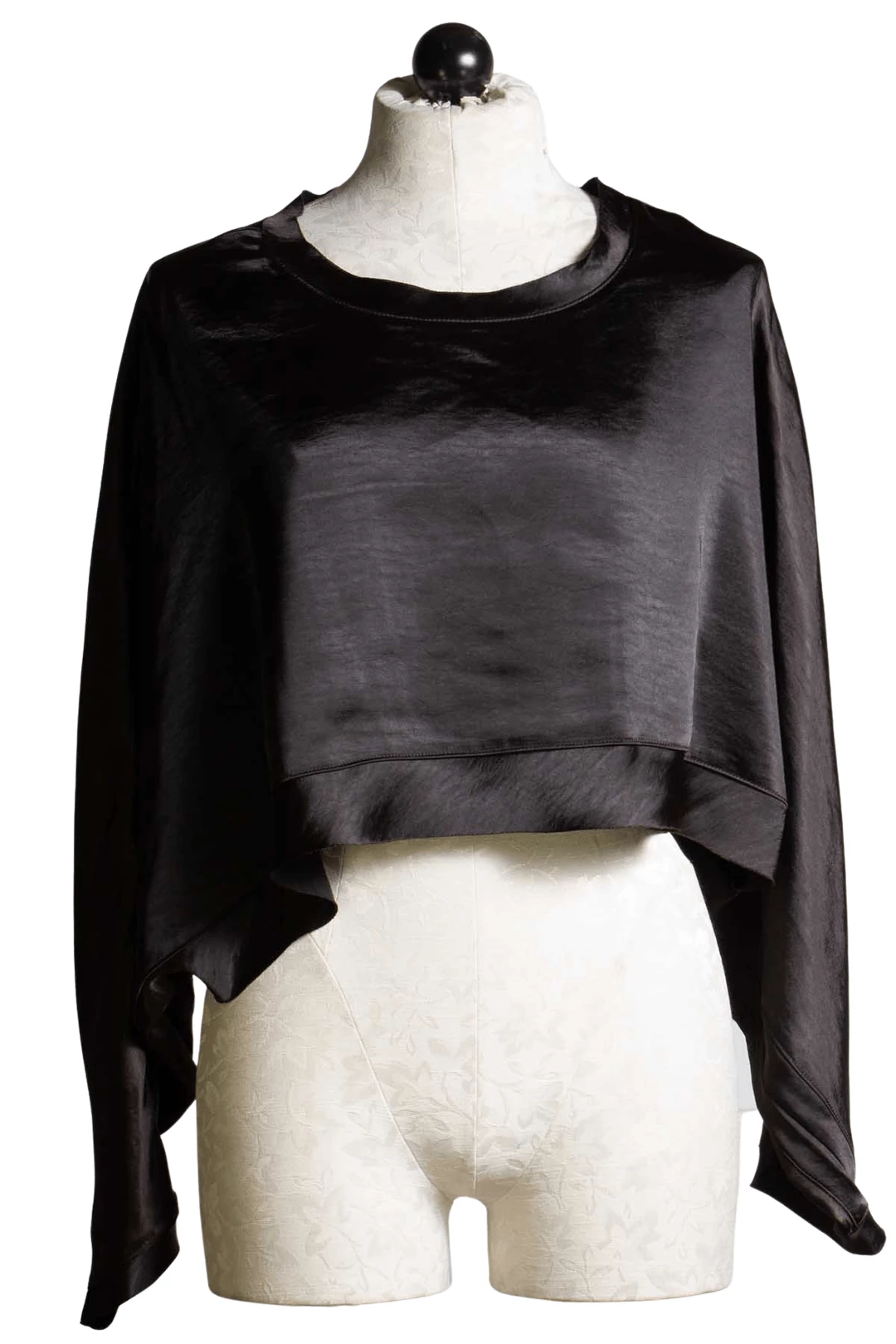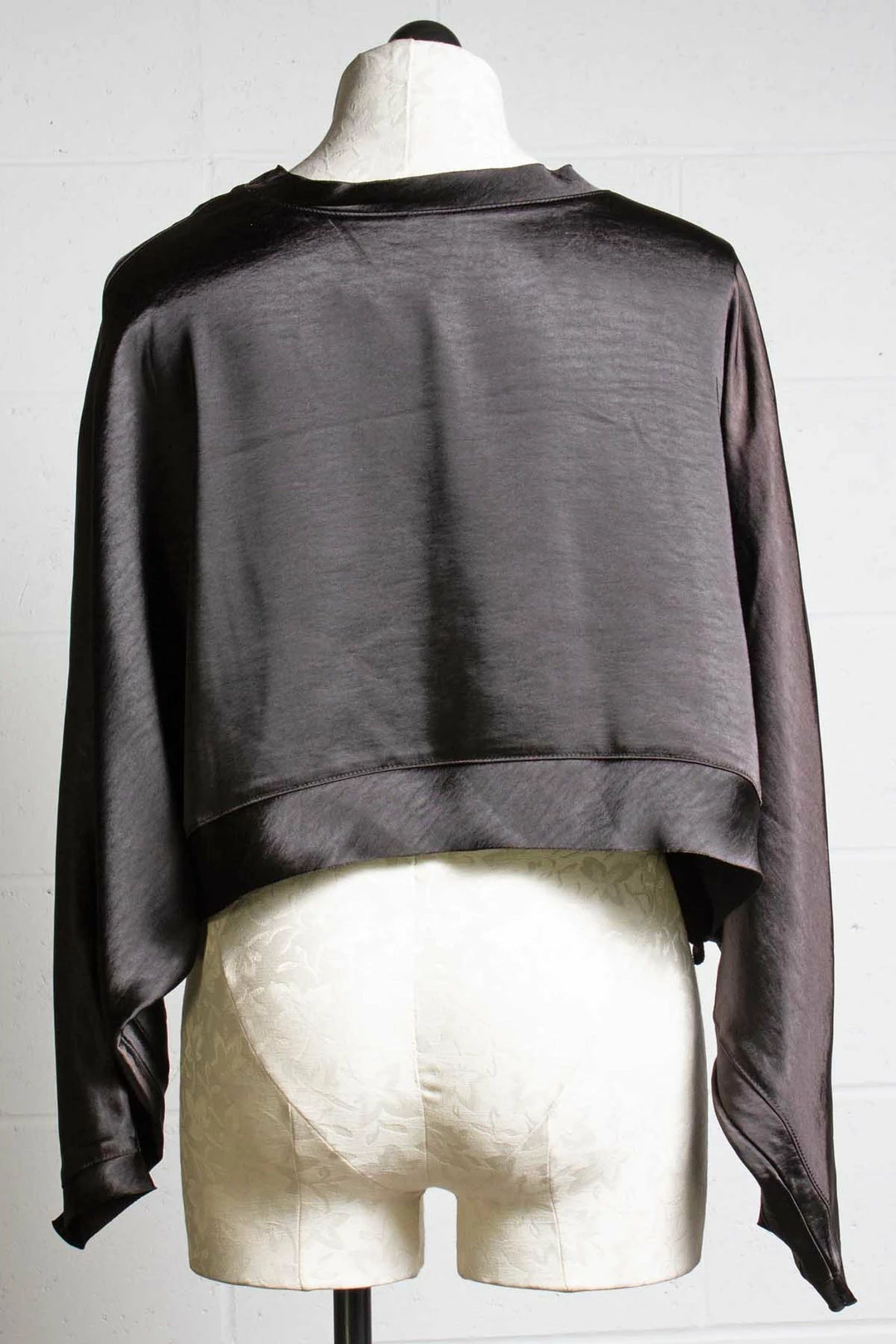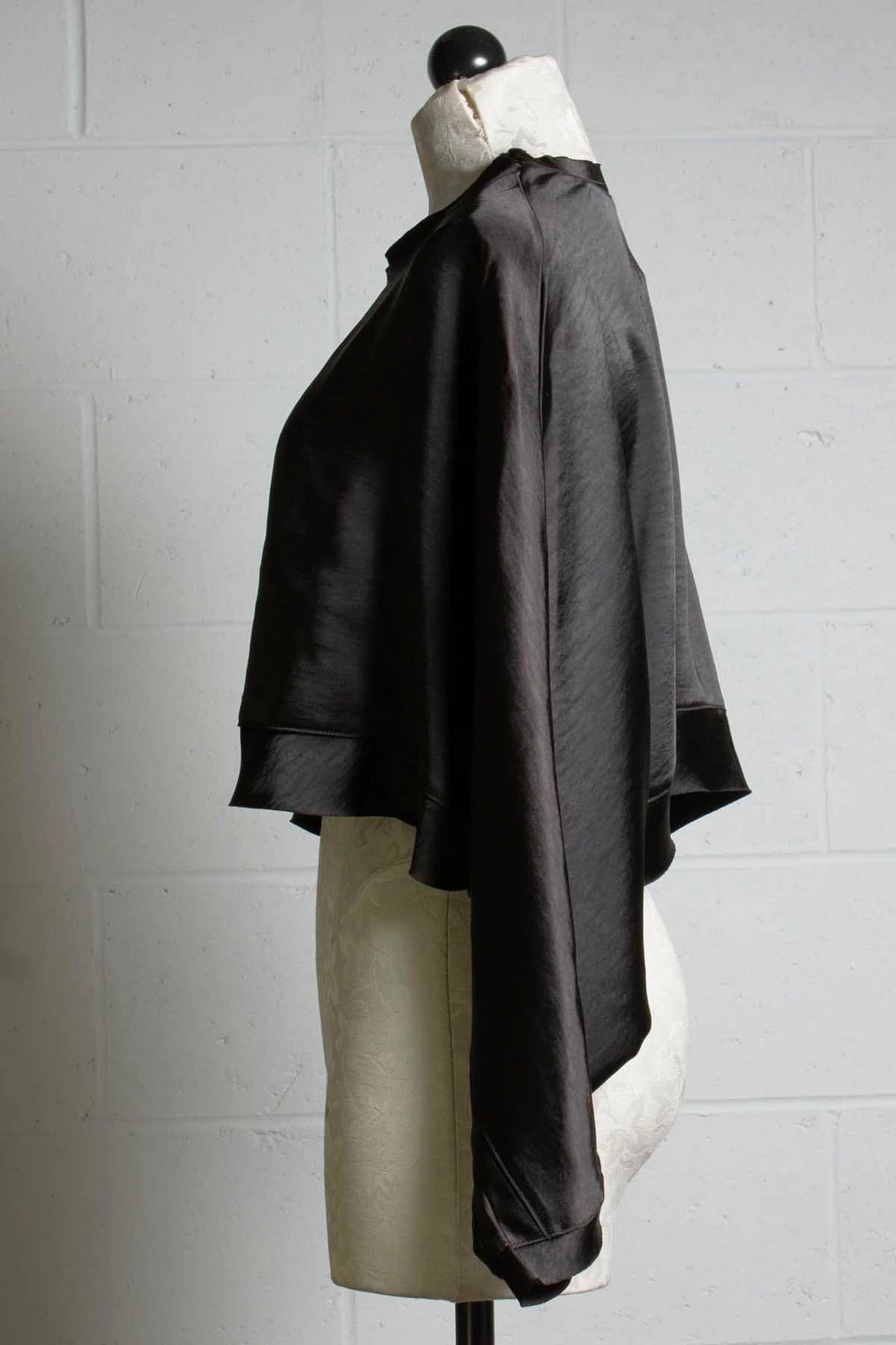 Wrap yourself in luxury with this Silky Cropped Shrug in Black or Sand by Planet. It is 100% PolySilk with roomy long sleeves and an oversized fit. Perfect for layering over tops, dresses, and sweaters.