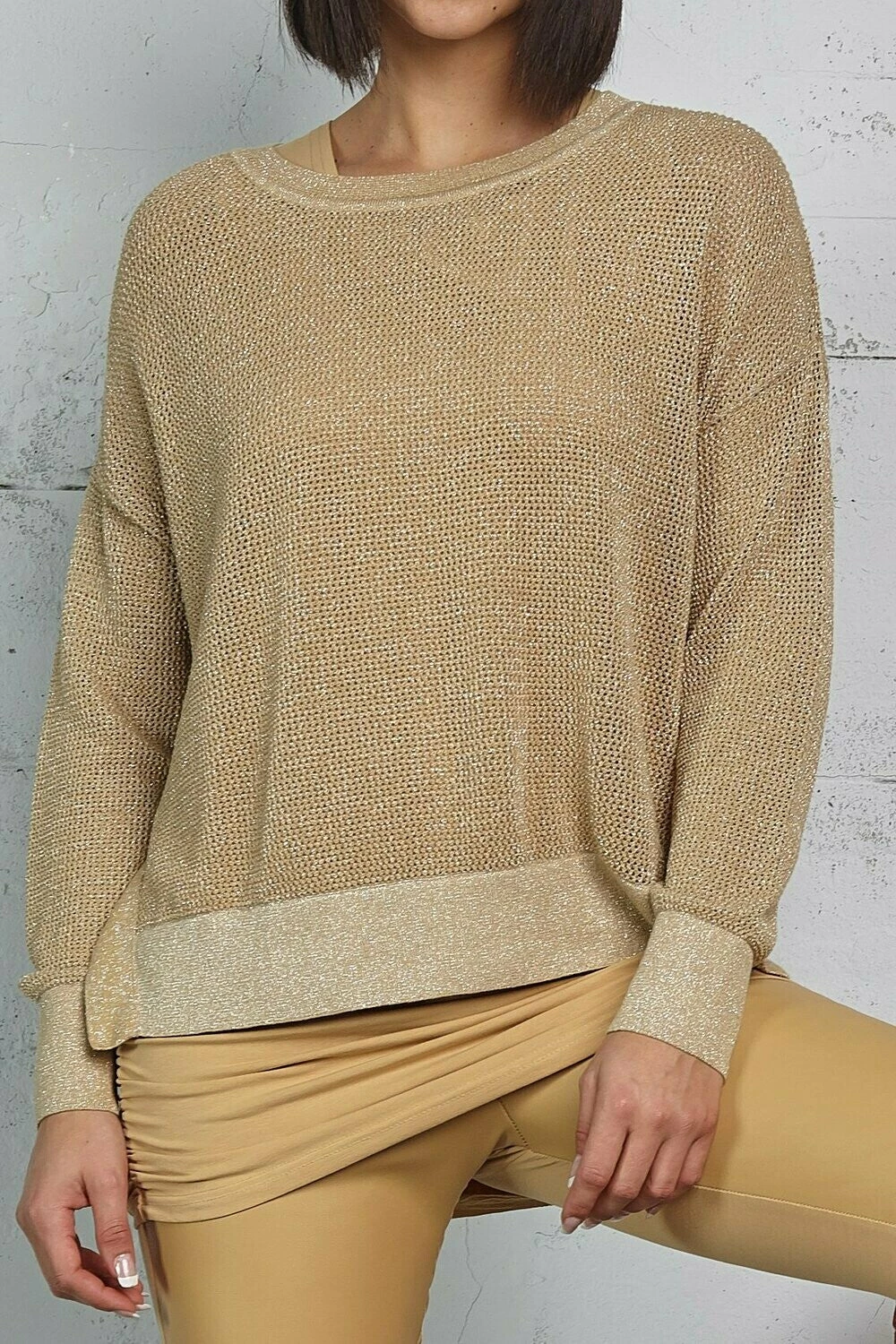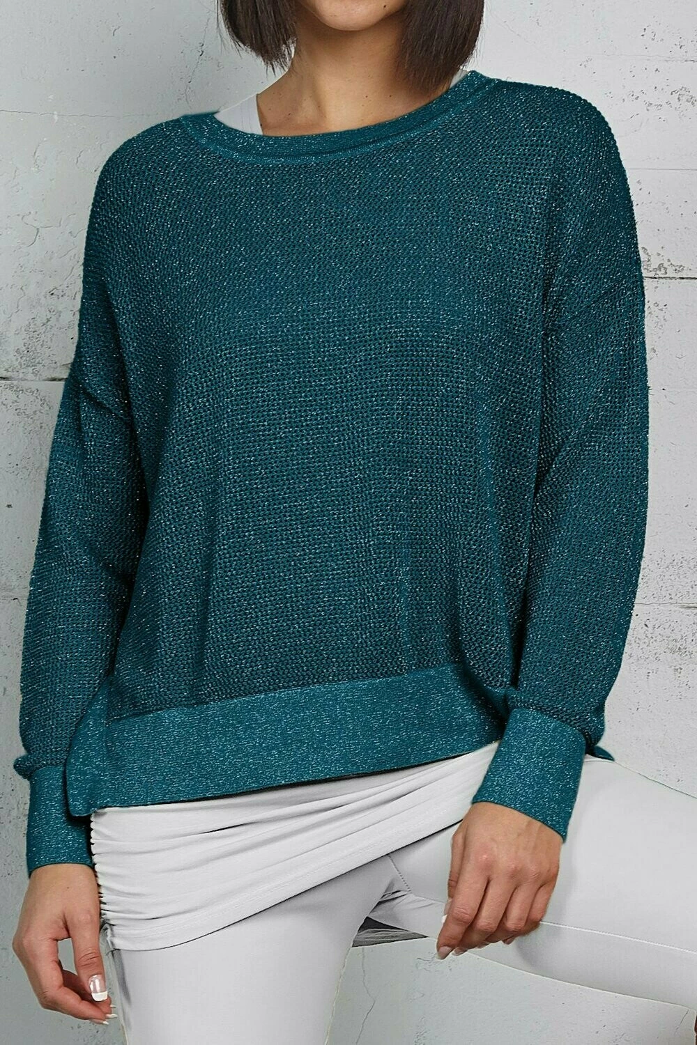 Shimmer while wearing our mini fashion basic. Soft metallic flecks add just the right amount of sparkle. Features: semi-sheer style, banded notched hem, drop shoulders and side vents. Outer metallic finish, inside pima cotton luxury.