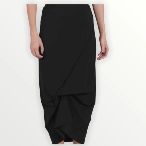 Porto Napoleon Skirt is a straight, close fit skirt in Jet Jersey collection. A fabulous travel companion, it is packable and easy to care for. Flat elastic pull on waistband and falls to mid calf with draped detailing at the bottom half of the front angled seaming and pinch-pleated gathering to create subtle folds. Chic European styling.
