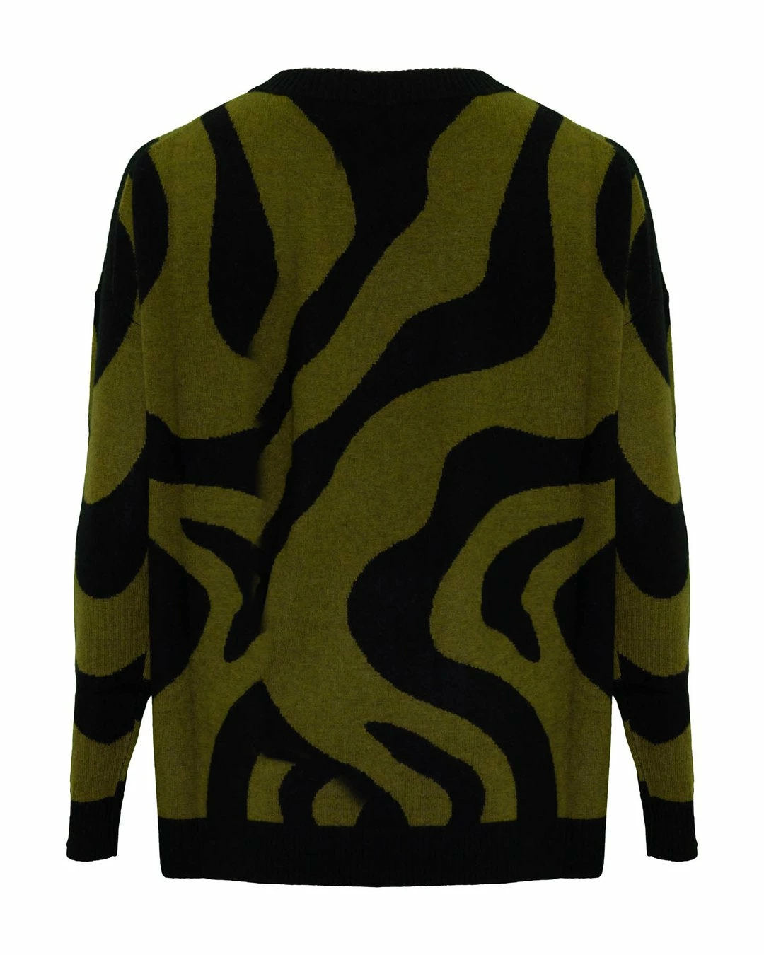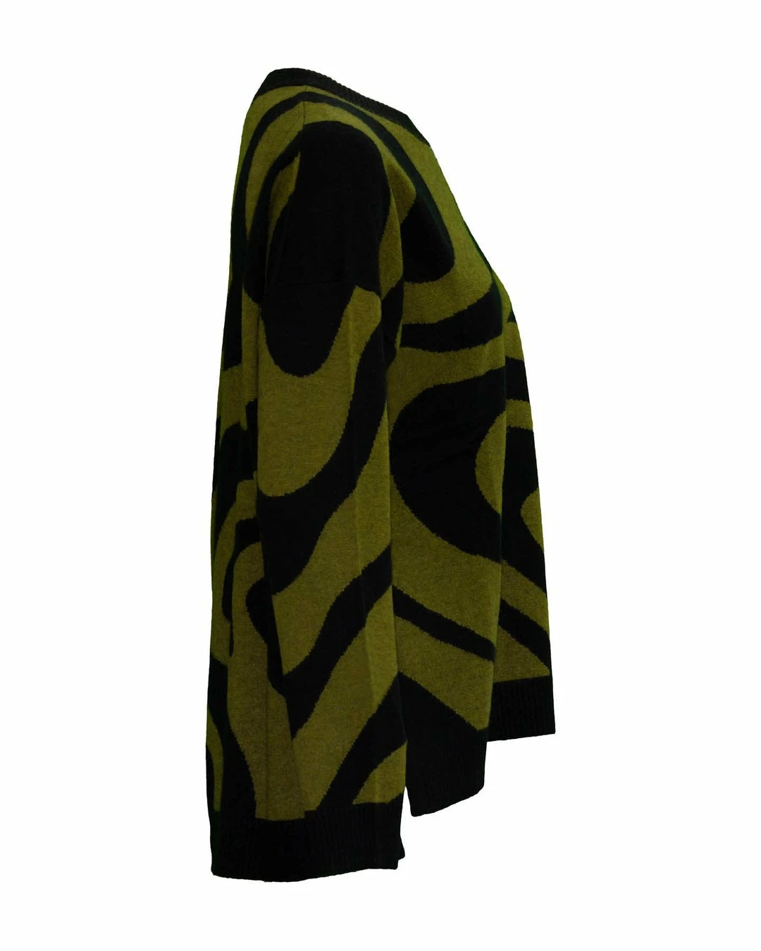 Soft cashmere wool blend relaxed fit crewneck pullover with GORGEOUS Olive and Black abstract print and contrasting ribbed trim, drop shoulders and side slits with slightly longer back
