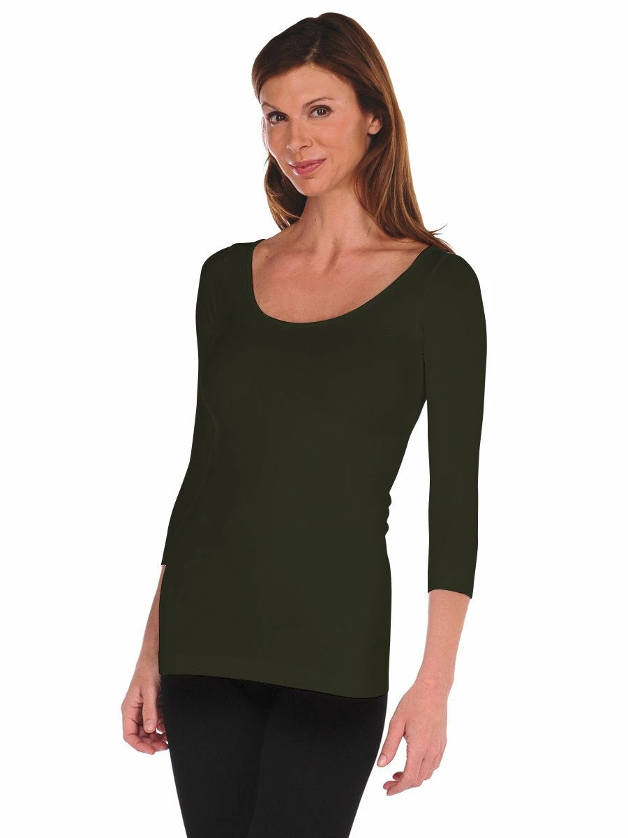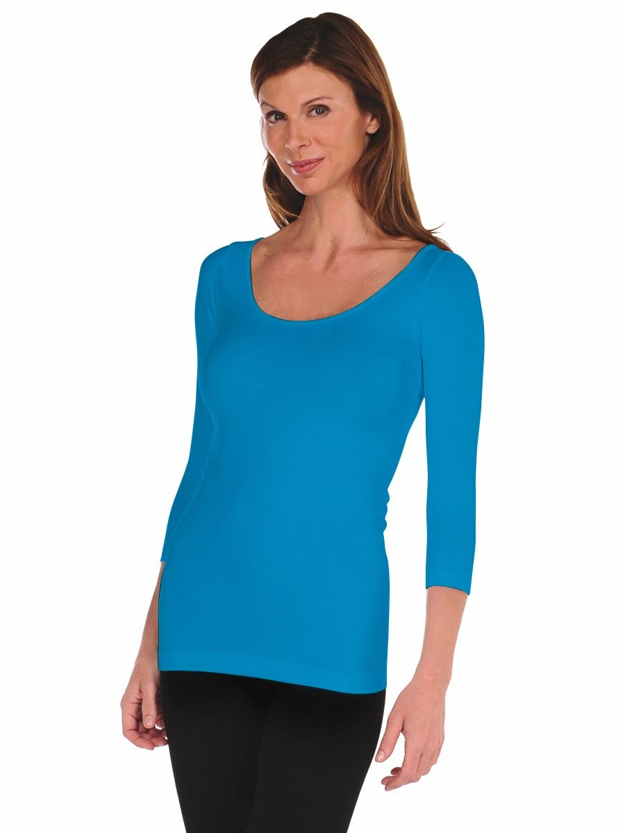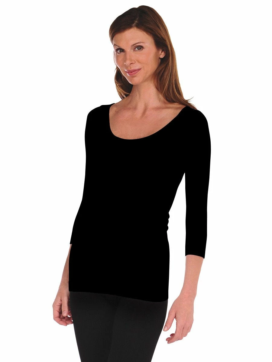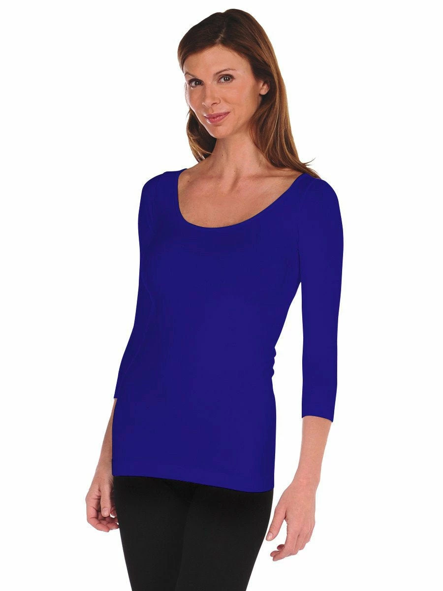 Tees By Tina classic 3/4 Sleeve Solid! Featuring a flattering scoop neck and the same clean lines, figure-flattering design and shape-smoothing fabric that make it a versatile, travel-friendly and layering wardrobe essential. Pair it with a pencil skirt or your favorite pair of jeans for a clean and classic look that goes from day to play or layer under your favorite sweater, blazer or jacket. Longer length keeps you covered and comfortable, all day long.