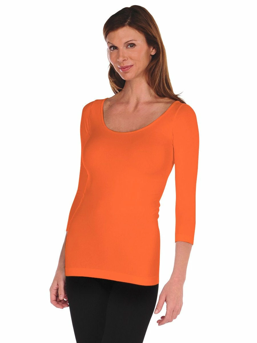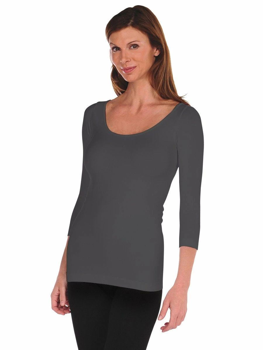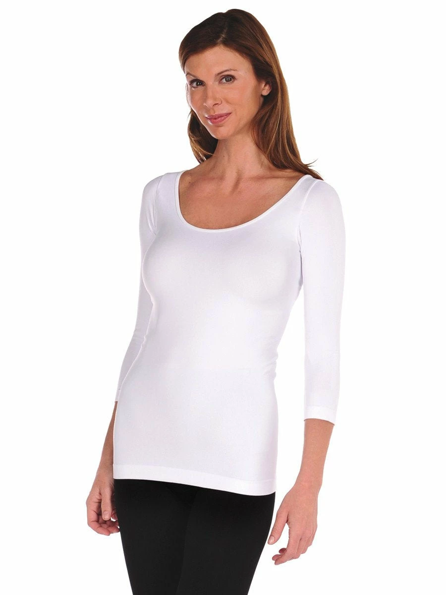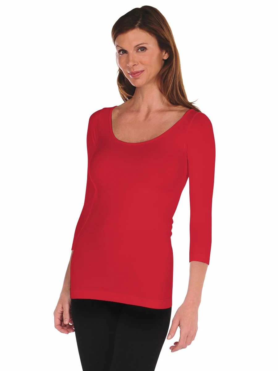 Tees By Tina classic 3/4 Sleeve Solid! Featuring a flattering scoop neck and the same clean lines, figure-flattering design and shape-smoothing fabric that make it a versatile, travel-friendly and layering wardrobe essential. Pair it with a pencil skirt or your favorite pair of jeans for a clean and classic look that goes from day to play or layer under your favorite sweater, blazer or jacket. Longer length keeps you covered and comfortable, all day long.